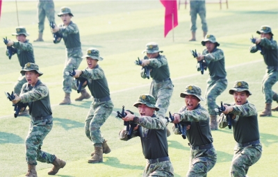 “刺、突刺——”刺杀操演练中,学员们的动作剽悍,身法灵活,让市民热血沸腾。