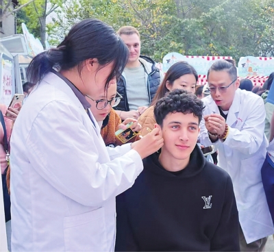 2025年武汉市中医药文化宣传周活动中,来自俄罗斯的亚当体验耳穴治疗。