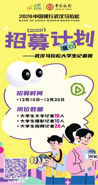 长江日报讯(记者张琳 通讯员袁仪 龚志铭)2026武汉马拉松大学生记者团招募活动将于2025年12月10日启动,武汉所有高校在校大学生均可以报名参加。
