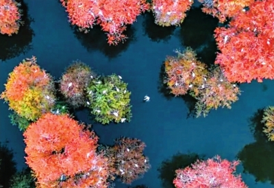 层层叠叠的红叶将水上森林染成绯红与橙黄交织的画卷。