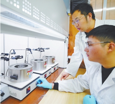 武汉理工大学船海与能源动力工程学院教师吕松(后)和参与研发出新型水凝胶的学生杨博文一起做实验。