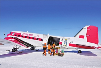 2015年11月30日,一架红白相间的固定翼飞机降落在南极中山站附近的冰盖机场,尾翼上的五星红旗格外醒目。