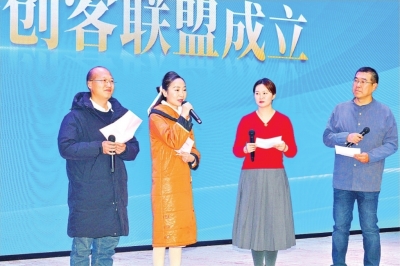 蔡甸区村干部助农团主播蒋浩(左一)、“挖藕奶奶”胡琴(左二)作为代表,现场宣读《武汉农业电商直播创客联盟倡议》。