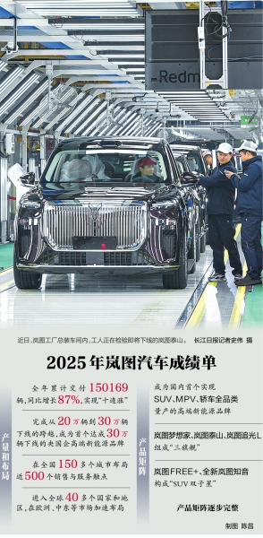 2025年,岚图汽车全年累计交付150169辆,同比增长87%,连年攀升,展现强劲发展势头;完成了从20万辆到30万辆下线的跨越,成为首个达成30万辆下线的央国企高端新能源品牌。2025年,岚图汽车实现“十连涨”,也是在“十四五”收官之年交出的一份量质并进的成绩单。