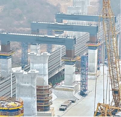 合武高铁雷家冲特大桥钢盖梁吊装完成。
