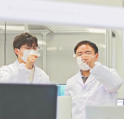 联华智造(武汉)生物科技有限公司联合创始人刘智勇(右)与同事正在观察客户生物样本。