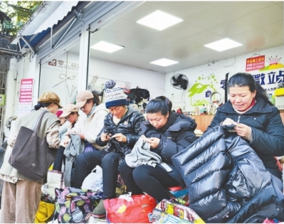 零工微站门口,女工们织补衣服,年轻顾客正在问价。
