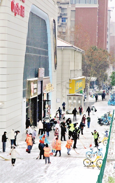 党员干部、环卫工人、物业工作人员及社区志愿者纷纷走上街头,开展扫雪除冰作业。