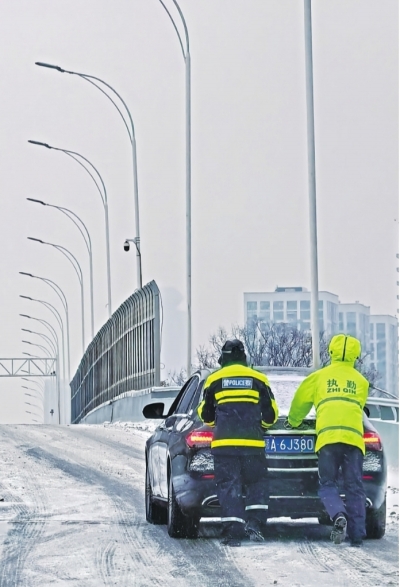 小轿车雪天打滑“趴窝”,交警合力推车帮脱困。