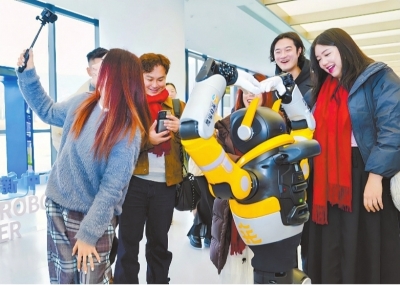 1月31日,在湖北省人形机器人创新中心,海外旅行达人与“武汉造”人形机器人互动。