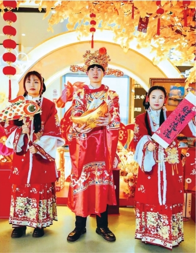 4日晚6时,“长江荣耀”游轮静静地停靠在长江岸边。在登船口,身着大红色古装的工作人员微笑着迎接游客。“我一上船就感受到浓浓的年味。”来自汉口的市民李阿姨带着孙子登船,看到两副长长的对联挂在轮船大厅上方,红红的“福”字被摆在楼梯旁,朱红色的拱形门框与大红灯笼相映成趣,构成一个充满现代感与传统韵味的节日场景。游客纷纷排队,等着在这个年味满满的场景中拍照。孩子则跑到旁边的市集摊位,玩起剪纸等非遗手作。