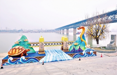 轮渡靠岸晴川码头,首届晴川灯会正在紧张布展。部分灯组已搭建完成,位于长江渡口纪念碑旁的“龟蛇起宏图”灯组,寓意屹立在武汉长江大桥两端的龟山与蛇山;仍在搭建中的“凤舞九天”灯组与黄鹤楼遥遥相望。