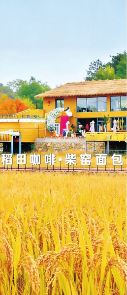 秋日丰收稻田中的乡巴克咖啡馆。