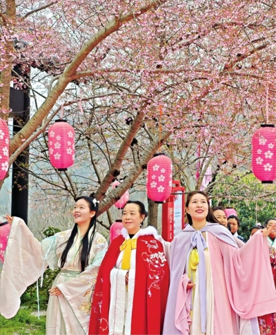 第一次来清凉寨游玩的私营业主黄女士和朋友,也体验了一把古风短剧拍摄。她们在化妆师的帮助下换上明制汉服,准备演绎一场赏花游园的戏码。黄女士兴奋地告诉记者:“我们都是第一次穿汉服、化古妆,在这么美的樱花林里拍戏,感觉特别新奇!等会儿还要去品尝药膳小火锅,这种沉浸式体验太有吸引力了,以后还会再来。”