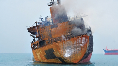 这是3月12日在伊拉克巴士拉省附近海域拍摄的遭袭油轮。