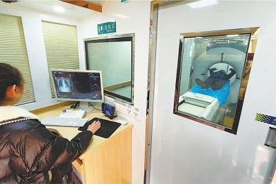 长江日报记者登上AI移动CT车,只见车内检查区和驾驶室被隔离开来。检查区分为控制区和CT室,CT室正中间放置着一台先进的移动CT机。在操作人员指导下,正在体验的46岁张先生躺到检查床上,双手举过头顶,随着仪器的启动,仅用两分钟就完成了CT检查。
