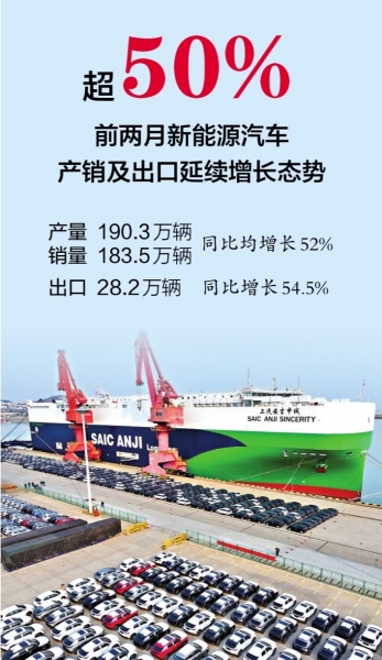 数据显示,我国新能源汽车产销量延续快速增长态势。1至2月,新能源汽车产销量分别达190.3万辆和183.5万辆,同比均增长52%。