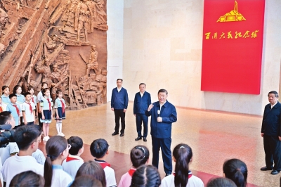 在纪念馆大厅,习近平同前来参观的青少年学生和纪念馆工作人员亲切交流。他说,88年前的今天发生的“七七事变”,是中华民族全面抗击日本侵略者的起点,前事不忘、后事之师,到这里来就是接受精神洗礼。广大青少年生逢其时,要赓续红色血脉,树立强国有我的远大志向,做堂堂正正、光荣自豪的中国人,勇担民族复兴的时代大任。