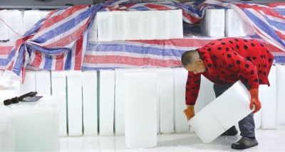 记者探访发现,该制冰厂的冷库内温度极低。在出货口封闭的情况下,最低温度可达-15℃,里面整齐摆放了不同规格的冰块。为防止寒气侵入身体,冰库里有工人穿着棉服、棉裤工作。