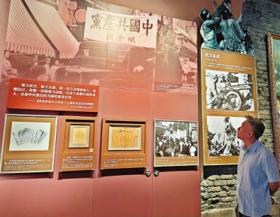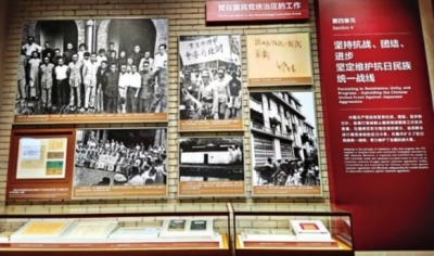 主题展览第一部分的第四单元《坚持抗战、团结、进步 坚定维护抗日民族统一战线》中,介绍中国共产党在国民党统治区的工作,武汉曾经是中共维护抗日民族统一战线的中心城市之一。