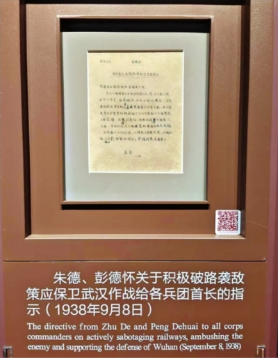 现场还展出,1938年9月,朱德、彭德怀关于积极破路袭敌策应保卫武汉作战给各兵团首长的指示;叶剑英向国民政府军事部门呈报的关于八路军、新四军配合武汉保卫战歼敌的电文;1938年8月7日《新华日报》刊载的社论《共产党员在保卫武汉中的责任》……