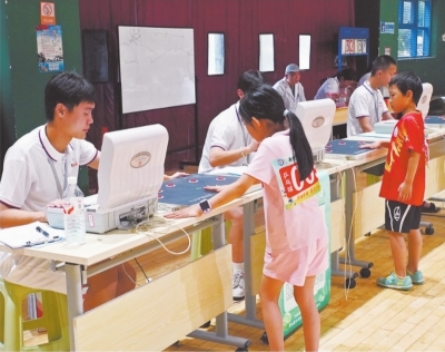据介绍,今年夏令营分成了三个阶段:技能培训、专业测试和优苗训练营。第一阶段通过发放体育消费券的形式,吸引了近万名青少年在遍布全市各区的业余培训点接受了技能培训。这次测试活动是第二阶段,共有700余人参加乒乓球、羽毛球、网球、足球、篮球、摔跤、射击、射箭、游泳、体操等10个项目的测试。通过测试的孩子则会进入第三阶段,也就是优苗训练营,孩子们可以进入市体育局直属训练基地参加7天的集训,免费体验专业队训练,并获得“优苗”证书。