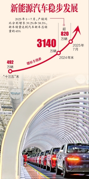 中汽协会最新发布的数据显示,2025年1至7月,新能源汽车产销量双超820万辆,市场渗透率进一步提升至45%。《新能源汽车产业发展规划(2021—2035年)》提出的到2025年新能源汽车新车销售量达到汽车新车销售总量的20%左右,这一目标已提前超额完成。