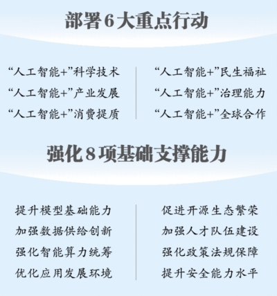 意见部署了6大重点行动,即“人工智能+”科学技术、“人工智能+”产业发展、“人工智能+”消费提质、“人工智能+”民生福祉、“人工智能+”治理能力、“人工智能+”全球合作。