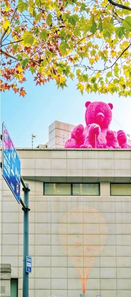 令大家感觉很有趣的是,这只在天空上的粉红熊雕塑与曾经的网红打卡点“红气球”同框了。2020年,武汉美术馆(汉口馆)外墙上的名为《地图》的公共艺术作品走红网络,吸引无数网友来到“红气球”下拍照。随着风吹日晒,气球褪色了,颜色变淡了,只剩下一圈模糊的轮廓可见。如今,粉红熊的加入,又为城市街头带来了新的故事与新的风景。