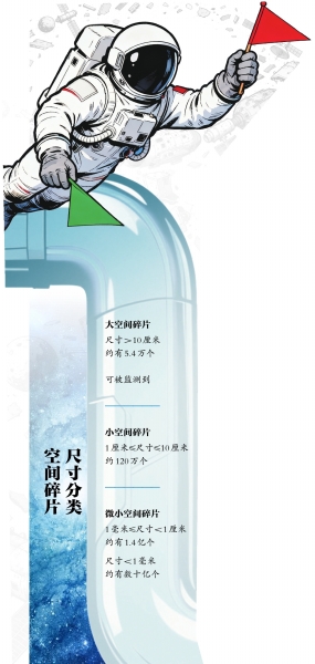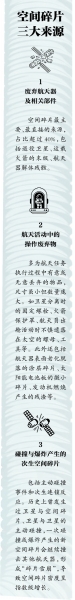 人造地球卫星、空间站等航天器,在寿终正寝或中途夭折后,就会变成太空垃圾。一般来说,距地300千米的空间碎片寿命约为一年,到了600千米高度就会飞上几十年,4000千米以上则要飞上千年,再高的空间碎片几乎会永远飞下去。