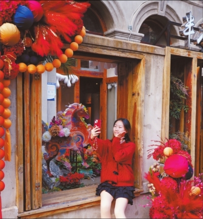 武汉街头,新春年味渐浓,吸引年轻人打卡拍照。