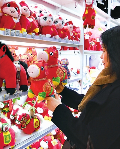 杨桃抽空端起水杯,喝了一口早已凉透的水,目光却一直盯着门口。这时,一名年轻顾客举着手机进店,对着几个造型憨萌的毛绒马玩偶打开视频通话:“妈,您看哪个好看?给家里小朋友都带一些。”手机屏幕那边传来阵阵笑声。“这几款造型可爱,卖得特别好,都快没货了。”杨桃热情地介绍。