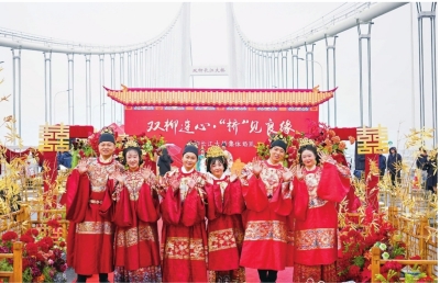 3月18日,在大桥通车前夕,湖北交投双柳桥公司、中交二航局和中建三局等建设单位,为3对因工程建设一再推迟婚期的新人,在桥面上举办了一场“双柳连心 桥见良缘”的集体婚礼。