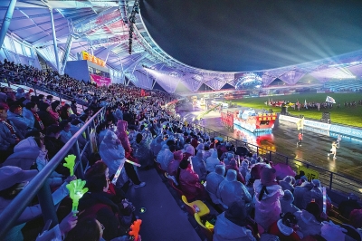 银鞍照白马,飒沓如流星。白衣胜雪的“诗仙李白”手执安陆乡超旗帜策马而来,拉开了开幕式的序幕。数百名少年在比赛现场舞起彩绸,体育场上空,两条长龙腾空而起,瞬间点燃全场观众的热情。当“李白”携手“杜甫”“孟浩然”“汪伦”“高适”“贺知章”“裴旻”组成的“盛唐顶流天团”闪亮登场,也让千年诗意与体育激情完美交融。